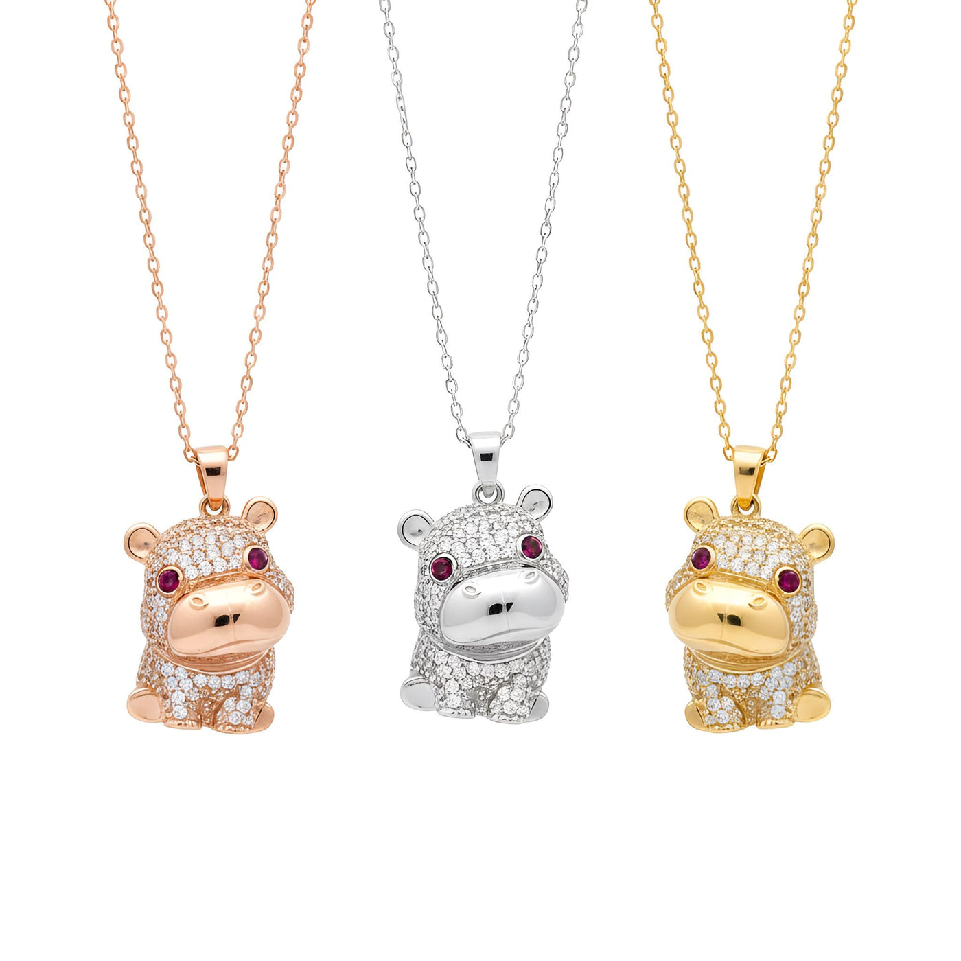 Bring a touch of whimsical charm to your jewelry collection with this stunning, handcrafted Hippo Necklace. Designed with meticulous detail, this little hippo is covered in shimmering pave stones and features striking ruby-red eyes that make it truly stand out.